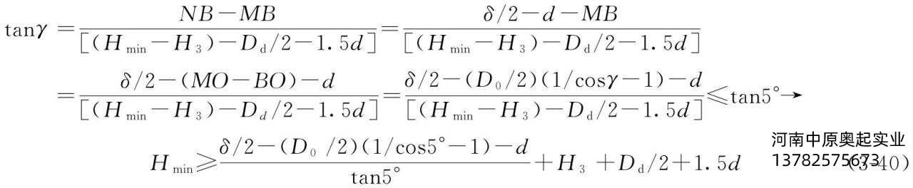 卷筒的*大偏角就是钢丝绳中心线在卷筒主视图平面内的偏角γ不大于3.5°(图3-54),当吊钩起升到*小极限距离,卷筒出现*大偏角。